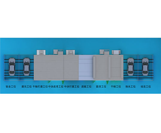 D.帶靜壓室, 帶地臺(配全格柵), 后側排風; 使用頂部滑軌三維烤燈進行底漆烘烤;