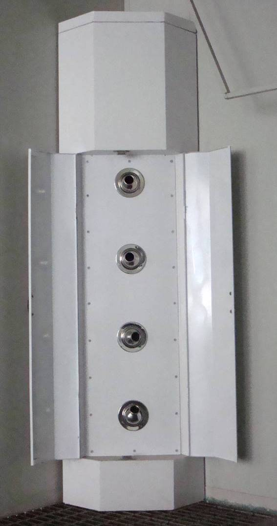 | 水性漆系統: | 為適合水性涂料噴涂作業,室內頂部共設置2排可調高速吹嘴,數量:32個;,由兩臺1.5kw離心式風機獨立送風。 | |||||||