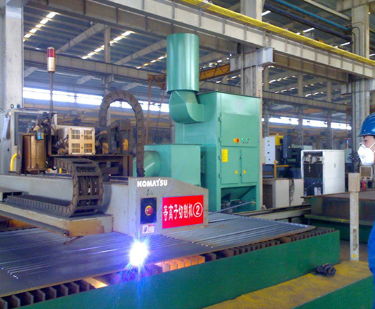 治理切割機切割過程中產生的煙塵,我公司采用全干式吹吸式除塵系統,即在切割平臺的一側放置滑動吸風道,吸風口固定在切割機的一側可以隨切割機來回移動。吹風口同時也固定在切割機另一側隨機移動。當切割平臺上部覆蓋鋼板后在切割平臺的下部一吹一吸使切割平臺的下部形成一個風道有利于煙塵的抽走。